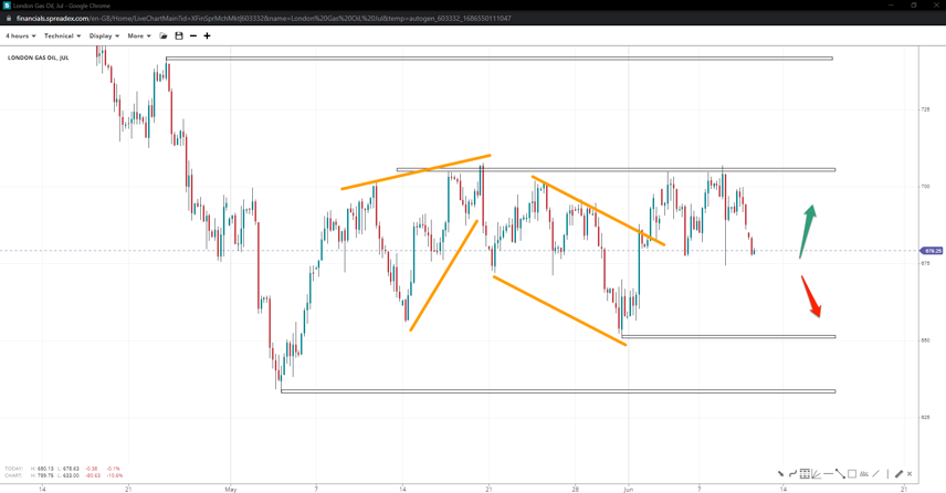 While London gas’ structure appears corrective, a wedge followed by a 5-wave flag off 650c could indicate further upside towards 745c in the immediate aftermath of a potential triple-top breakout. The thesis requires firmness of 670c or risks a decline toward 635c via the support at 655c.