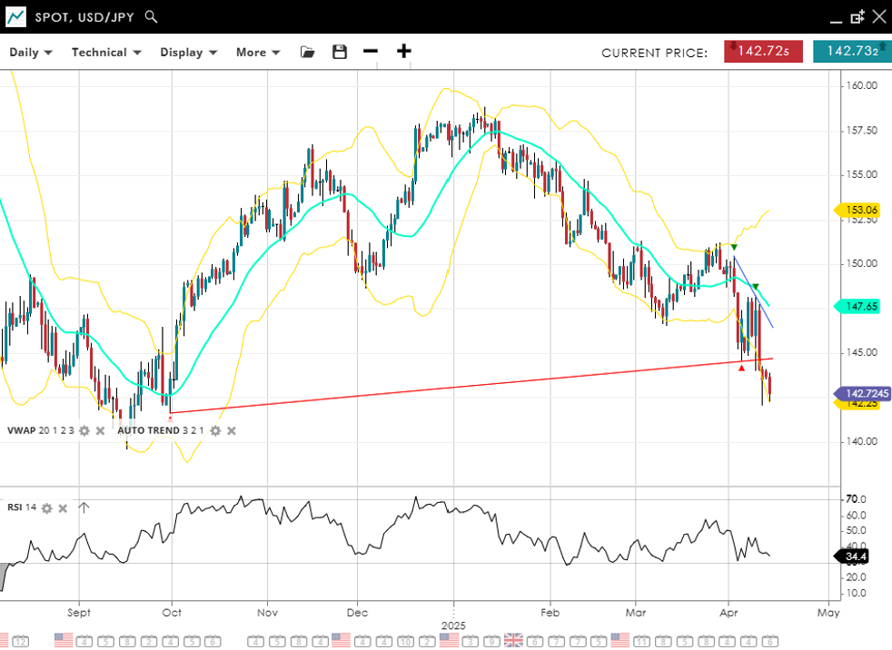 USD/JPY is in a bearish impulsive move, trading at 142.73, beneath the VWAP of 147.65. The RSI at 34 suggests weakening momentum, close to oversold but not extreme. Support is nearby at 142.43, with resistance up at 153.06.