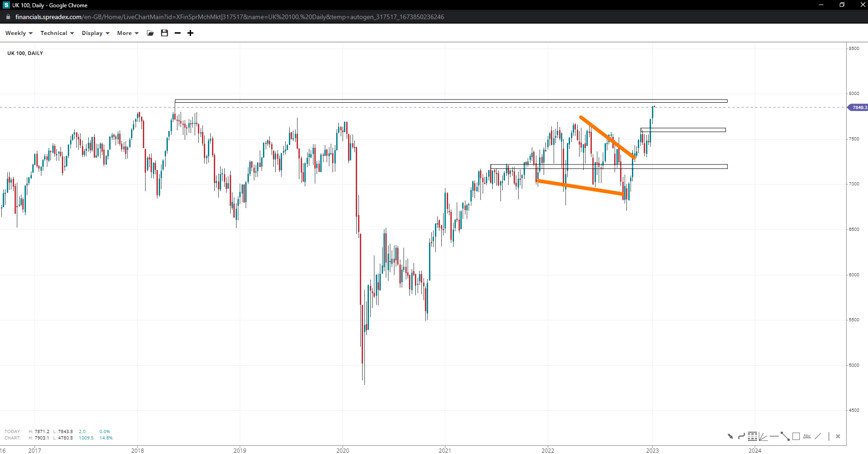 The FTSE has another surge towards 2018’s highs of 7900 and could reach the 8k handle and beyond if bears fail at a double top formation. 7690 is now short-term support, with 7220 a major stronghold of defence, but it still won’t invalidate the flag pattern even if reached.
