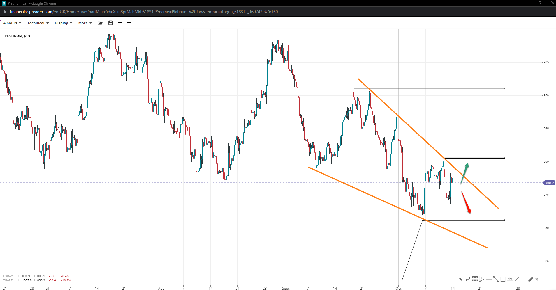 The price of platinum may be due to another downward spiral in light of a final leg of a potential wedge pattern down to the measured-move projection of $810/oz, provided the lower trendline near or under 850 gives way. Exiting the diagonal at the $900 swing could see the metal accelerate towards $955, where the pattern would be deemed invalid.