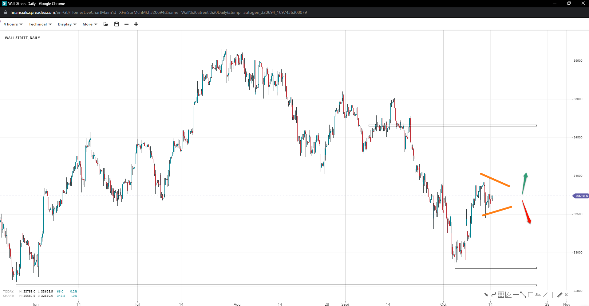 The retest of 33450 in Wall Street suggests the short-term support may form a triangle pattern or simply consolidate, offering a break past 34k and towards 34620. Losing the swing low may instigate a drop towards 32640 unless 33k leads to a bounce.