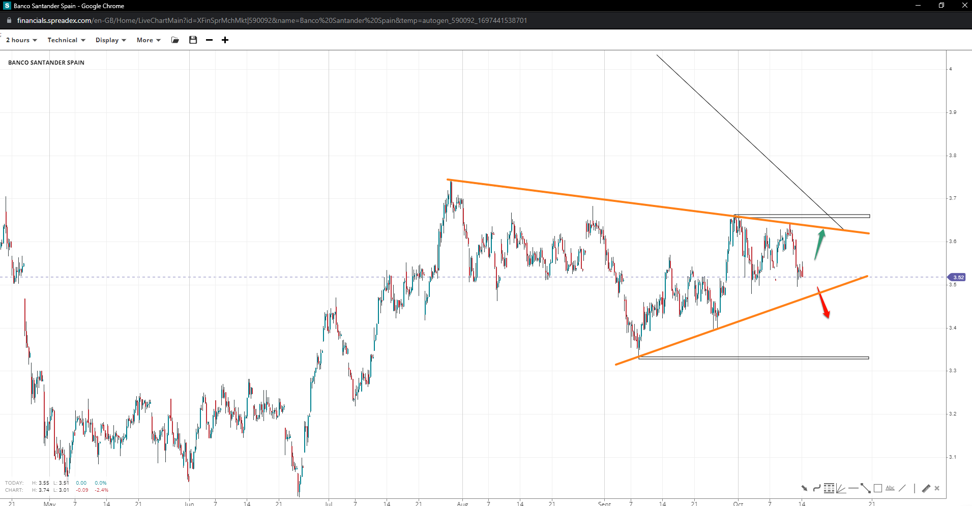 The stock price of Spain’s Santander resembles an incomplete triangle, with prices staying over 3.40 and the low of 3.33, raising the probability of revisiting the 4 EUR barrier –being the measured move projection. If 3.65 and 3.75 fail to fuel demand, the lower trendline will likely give in sooner rather than later.