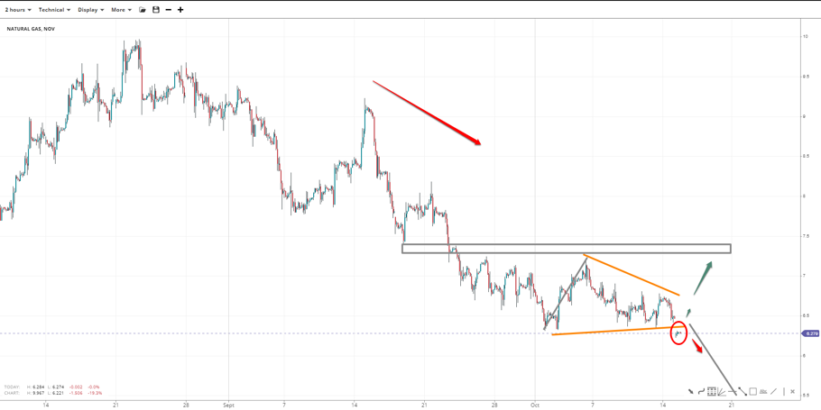 Natural gas consolidated in a descending triangle formation and recently breached its low, clearing the path to 6.00 unless it re-enters the triangle territory. 5.40 is the measured move low, where a reversal could be expected. If bulls regain control of 6.50 and 7.00, the low might be in at 6.20, with the next resistance at 7.30.