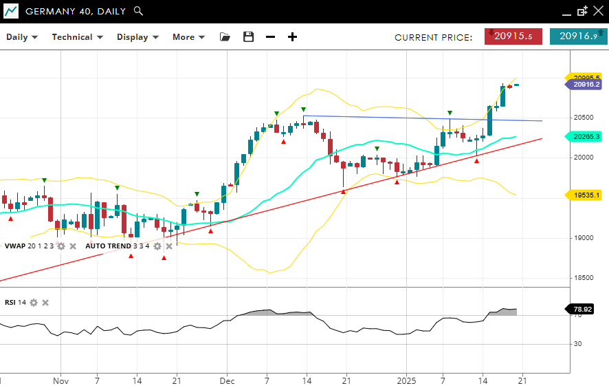 The Germany 40 is in a robust bullish impulsive phase, trading at 20,916, significantly above the VWAP (20) level of 20,265. Key support is established at 19,535, with resistance at 20,995. With the RSI soaring at 78, the market is approaching overbought conditions, underscoring strong upward momentum.