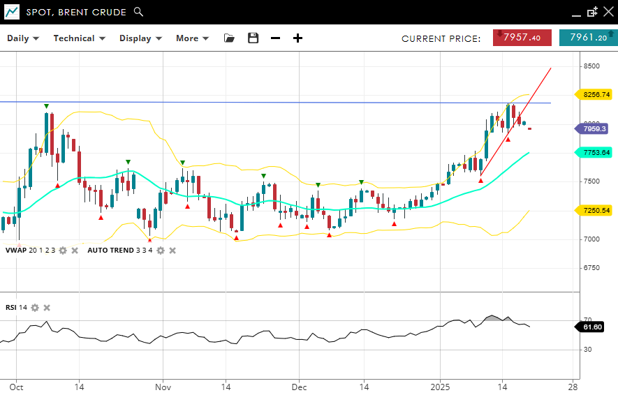 Brent Crude’s bullish impulsive movement persists as it trades at 7959, comfortably above its VWAP (20) of 7753. Support is set at 7250, while resistance is capped at 8,256. The RSI at 61 indicates firm momentum, albeit down from overbought territory.