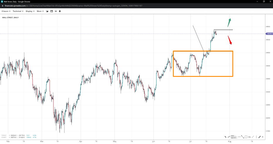 Wall Street formed a double bottom at 33600 and soared past the top at 34580 for an attempt at 35k. The measured move projection opens up speculation for an extension to 35550, thus 36k, unless bulls fail to recapture 35370.