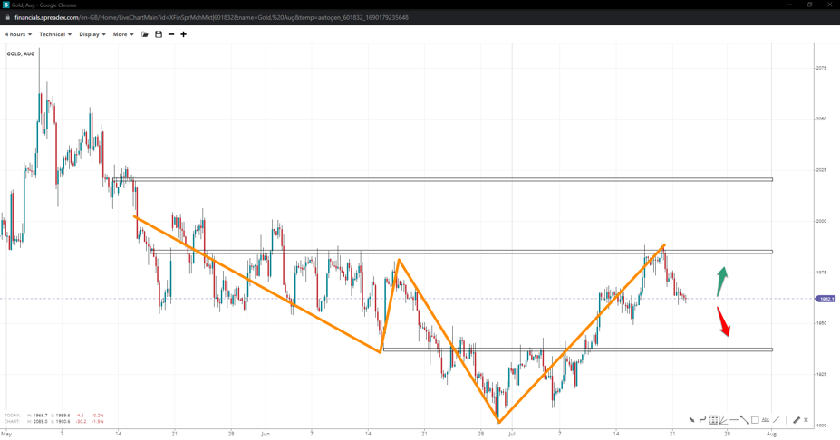 Gold found resistance shy of $1990/oz, increasing chances of an inverse H&S pattern with a leg down to $1940/oz. Soaring higher might let bulls reclaim 2k, but they will unlikely arrive at $2020/oz.