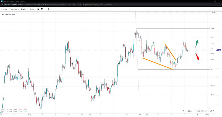 The price of natural gas completed a falling wedge by $2.48/cf, inspiring bets towards the peak of $2.93/cf and the 138.2% reverse Fibonacci of $3.1/cf. If bullish p[rice action disappoints, the structure might shift to a range or flag, raising the downside potential towards $2.30/cf should the regional low of $2.5/cf succumbs to pressure.