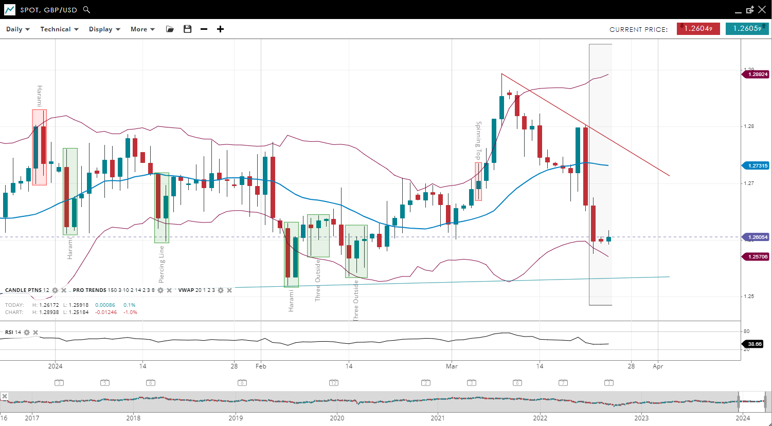 EUR/USD might be coming to the end of its bullish trend and is now in the corrective phase, with its price at 1.0819, below its upward-sloping 20-period VWAP of 1.0885. The support is now at 1.0789, with resistance at 1.0980. The RSI at 43 indicates a shift to negative momentum.