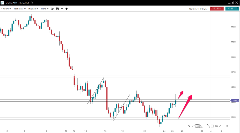 The price of GER40 tried to reverse to the upside twice but it failed. Currently, the market is trying to break the 13,270 mark to the upside. If the buyers manage to break this level and the current daily bar closes above it, then we could see the “GER 40” reaching the 13,685 mark.
