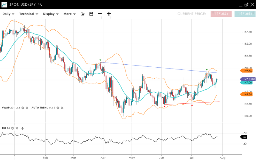 USD/JPY continues in a neutral trend but could be about to break higher, currently ranging around 147.66 and VWAP at 147.00. RSI at 57 shows a modest bullish bias after having pulled back from overbought territory. Support is at 144.54 and resistance at 149.46.