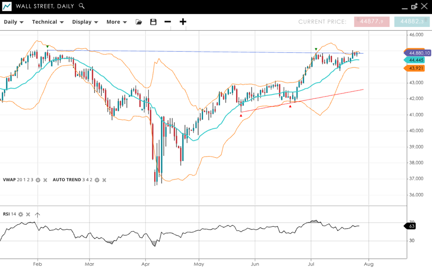 Wall Street continues its bullish trend, pausing near recent highs. The price is at 44,880, above its VWAP of 44,445. RSI at 63 confirms steady bullish momentum. Support sits at 43,921 and resistance at 44,880.