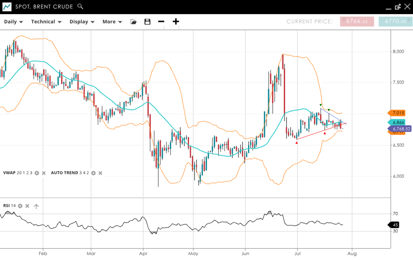 Brent Crude remains in a broad neutral trend with short-term range-bound action. Price is at 6,768, just under VWAP of 6,866. RSI at 45 reflects a lack of directional conviction. Support is at 6,717 and resistance at 7,015.
