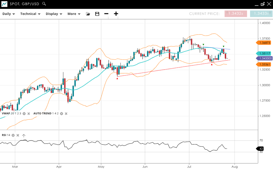 GBP/USD is in a bullish trend but under corrective pressure and seemingly turning rangebound. The price is 1.3433, slightly below the VWAP of 1.3511. RSI is at 42, hinting at waning momentum. Support is 1.3336, resistance at 1.3687.