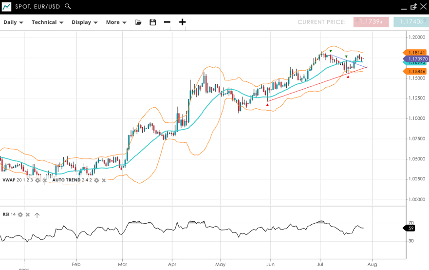 EUR/USD holds a bullish trend while undergoing a correction. It trades at 1.1740, close to its VWAP at 1.1699. The RSI at 59 shows mild positive momentum. Support is at 1.1585 and resistance at 1.1814.