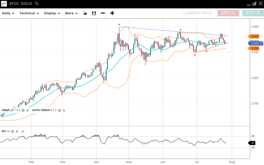 Gold continues to trade sideways within a broad range. It trades at 3,337, nearly equal to its VWAP. The RSI at 47 suggests balance. Support is found at 3,290 and resistance at 3,407.