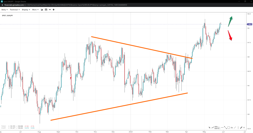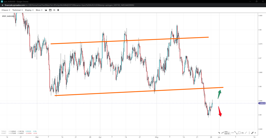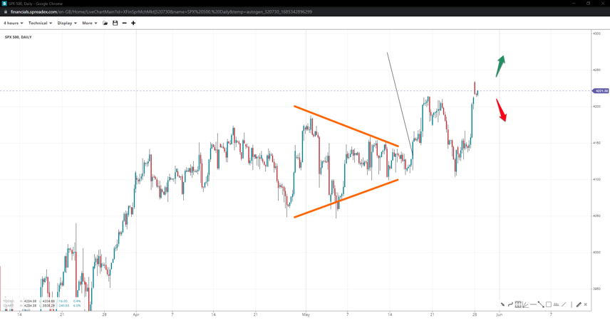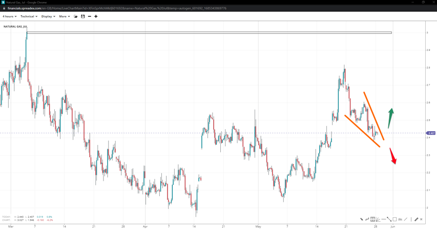 Wall Street could not break past 33300, but bulls managed to hold above the 33k handle in what appears to be a potential breakout towards 33750. If 33k is breached, a move toward the lower end of the range at 32500 will be more likely, but we might witness the formation of a falling wedge in doing so.
