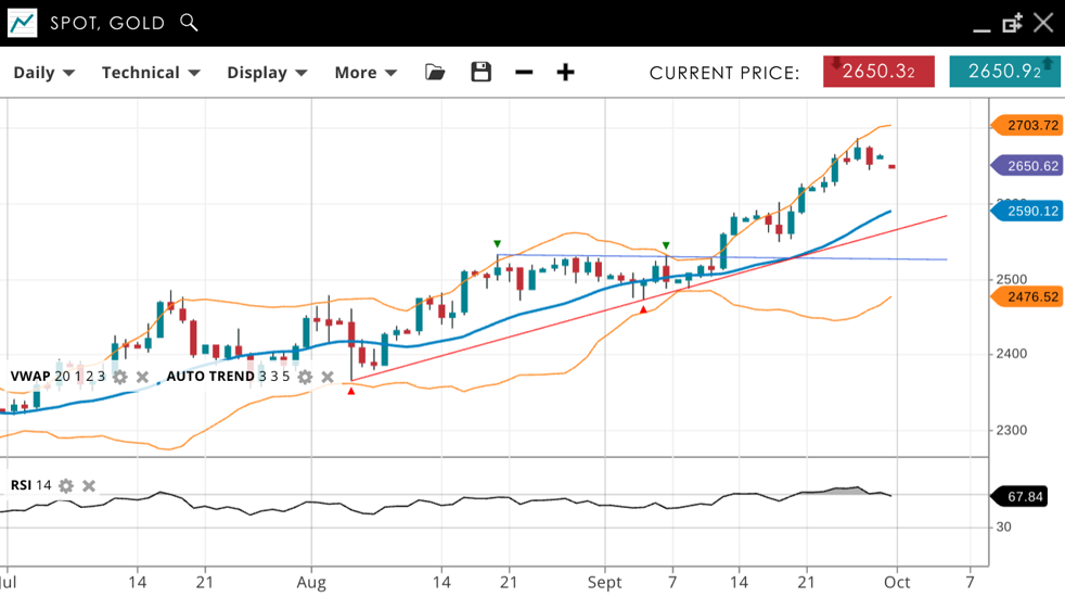 Gold continues its bullish run, currently in an impulsive phase. The price is at 2,650, above the VWAP (20) of 2,590. Support is at 2,476, with resistance at 2,703. The RSI of 70 signals strong bullish momentum, indicating overbought conditions.