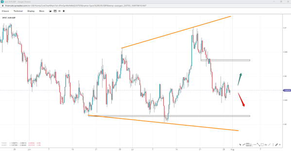 The EUR/GBP pair might be in a broadening triangle pattern, pending rejection at the bottom trendline under 0.85. If bulls lose 0.8550 and the low of 0.8516, the chances of seeing the pattern complete will rise. Conversely, advancing past 0.88 could inspire bullish bets, paving the way towards 0.8630.