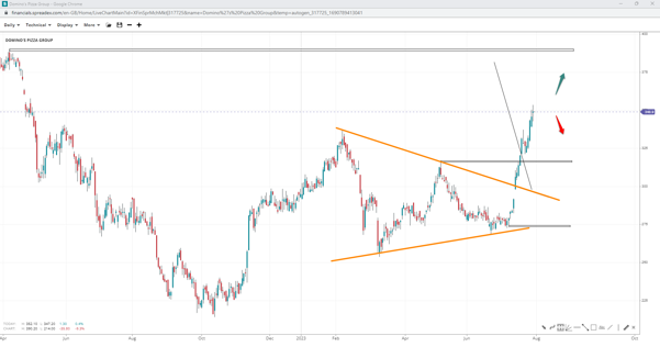 The stock price of Domino’s has left a pennant behind, forming support at 317 and the low of 275. Continuing its ascend might see prices near the peak of 390, as the measured-move projection suggests a potential reversal at 380.