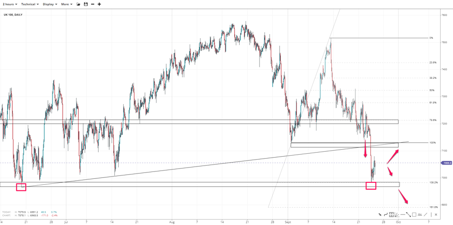 The UK 100 fell to the 7000 handle, forming a double-bottom and bouncing higher. A retest of the trendline might offer an upside move above 7100, but 7200 is unlikely to be reached. Lossing 7000 could extend the bearish leg to the 161.8% Fibonacci of 7130-7510 near 6890.