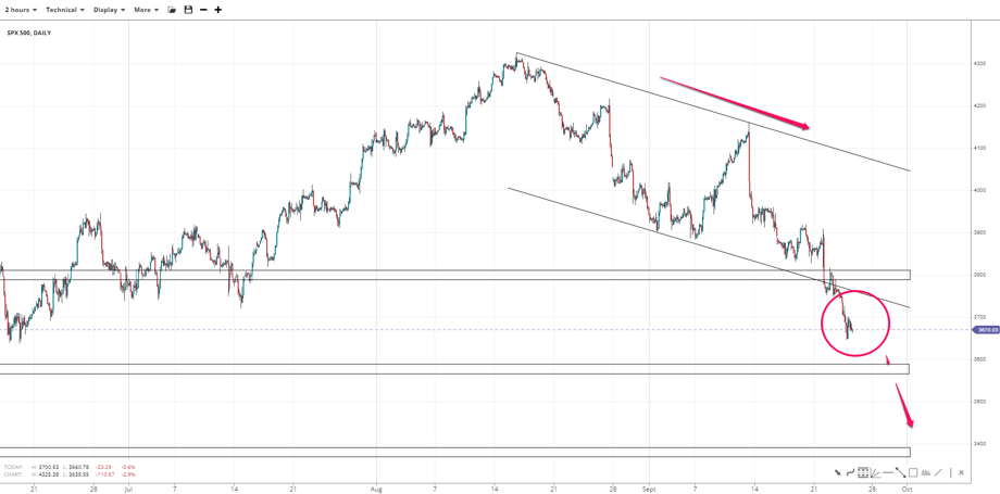 The SPX 500 slid down to the 3635 low, opening the door to 3600 as it failed to form a double-bottom. A move below there exposes 3400. If the low above holds firm, a bounce towards the channel near 3750 might offer a breath before further downside ensues.