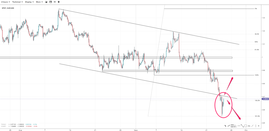 EUR/USD pulled back to 0.9700 after plummeting to the 161.80% Fibonacci of 1.0370-0.9860 at 0.9550. Near the bottom channel, a rejection might send prices down to 0.96000 and eventually 0.9500 if the record low softens. But if the channel gets penetrated while the pair trades above the 138.2% Fibonacci near 0.9670, 0.9800 is firm resistance.
