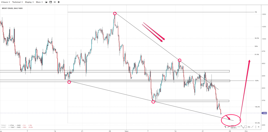 Brent oil crashed below 87.20 and the 138.2% Fibonacci of 105.00-91.50 near 87.50 before retesting it. Bears might be targeting the diagonal line of the 161.8% Fibonacci near 83.00, where a reversal is on the cards. A move above 87.20 exposes the 90.00 round resistance and the Fibonacci low of 91.50.