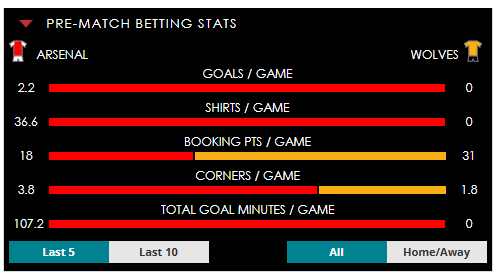 To see all the Arsenal v Wolves betting stats and form, visit our pricing page to view our Pre-Match betting stats table or hover over/tap the chart image to see previous outcomes for that particular market.